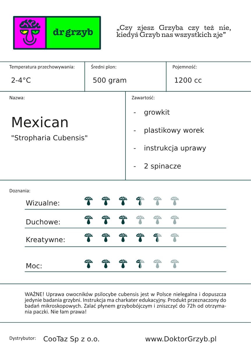 Uwaga: Grzybnia Mexican przeznaczona jest wyłącznie do badań mikroskopowych. Przestrzegaj obowiązujących przepisów prawa podczas korzystania z produktu, aby uniknąć nieporozumień.